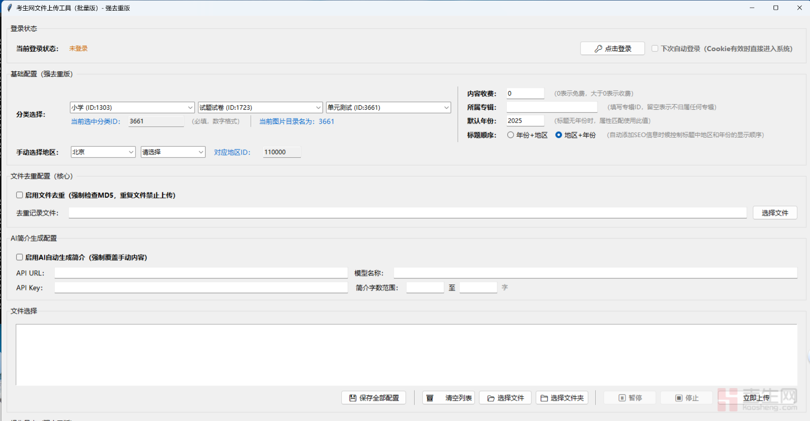 不管你是教育机构运营者、知识博主、题库创作者,还是考生网内容服务商,这款【考生网AI智能创作批量上传工具】,都是你依托考生网平台实现高效变现的核心利器。它以“脱离人工、全程AI全自动”为核心,让你只需选中文件夹,即可完成从上传到配置的全流程操作,彻底解放双手、节省运营成本;更能让你深度绑定考生网的独家优势——顶级域名流量、独有的“公域集中宣传+私域深度沉淀本地”双轮模式,以及海量内容带来的引流底气,践行普惠教育初心,让每一份优质知识产品都能通过公域集中曝光触达千万考生,再通过私域精细化沉淀固化本地市场,实现商业价值与社会价值的双重共赢,这是其他平台和工具无法给予的核心赋能!