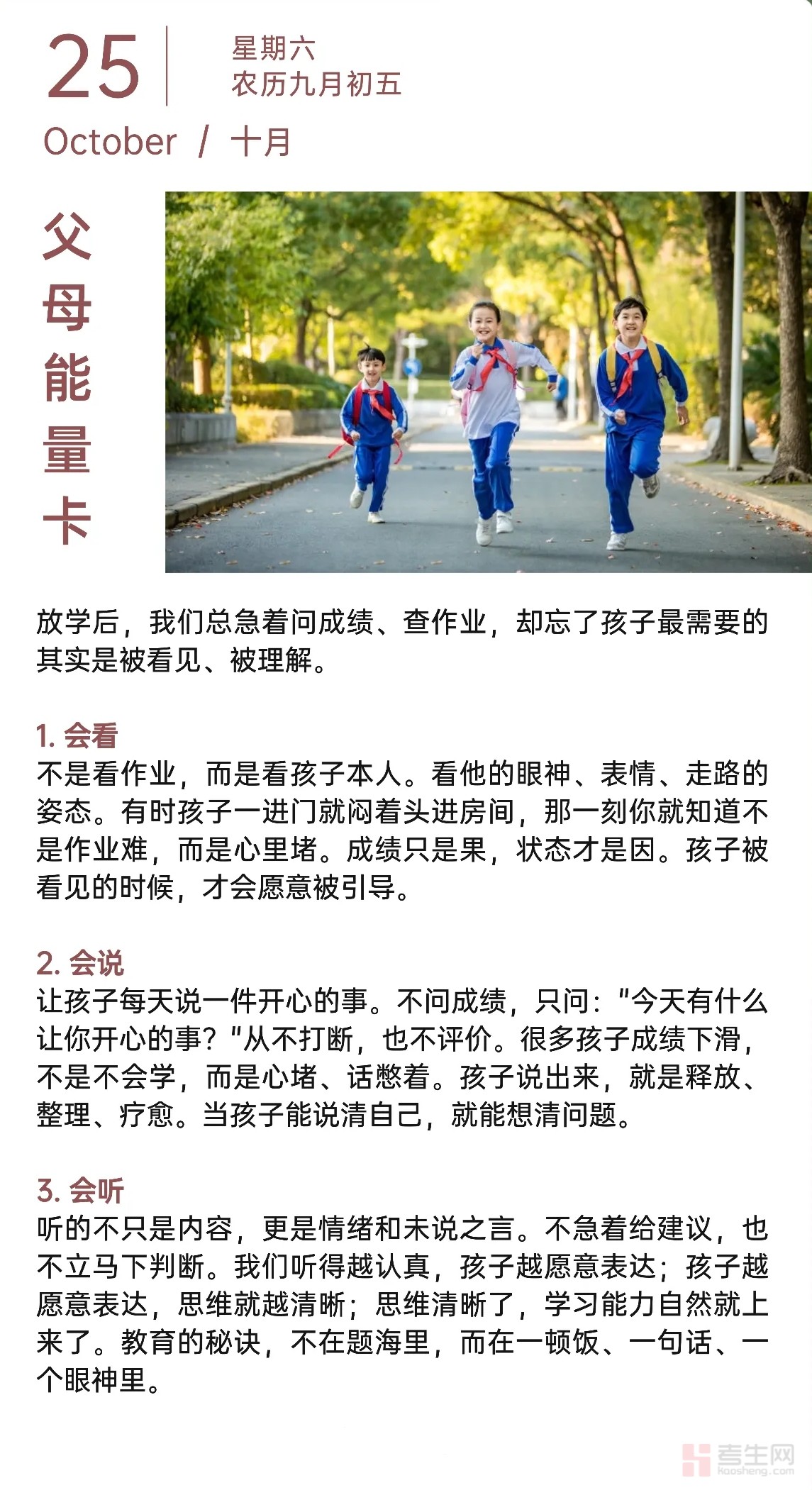 放学后,我们常常急着追问成绩、检查作业,却忽略了孩子心底最渴望的 “被看见” 与 “被理解”。本期考生网家校共育栏目推出的 “父母能量卡”,为您解锁放学后与孩子沟通的智慧,让教育的温度在 “会看、会说、会听” 中自然流淌。
