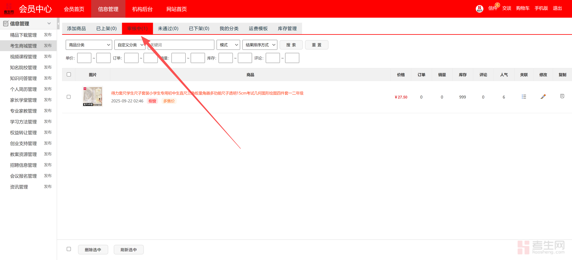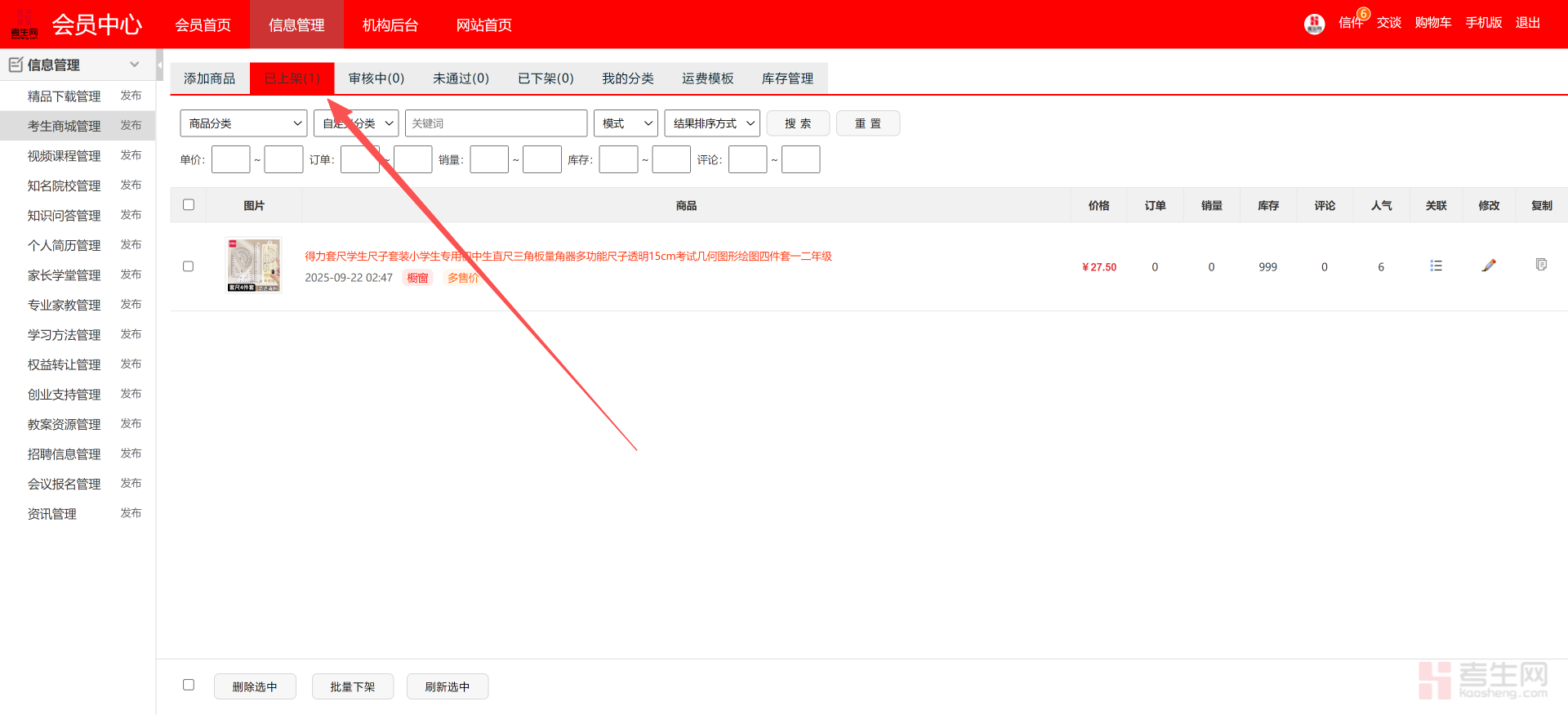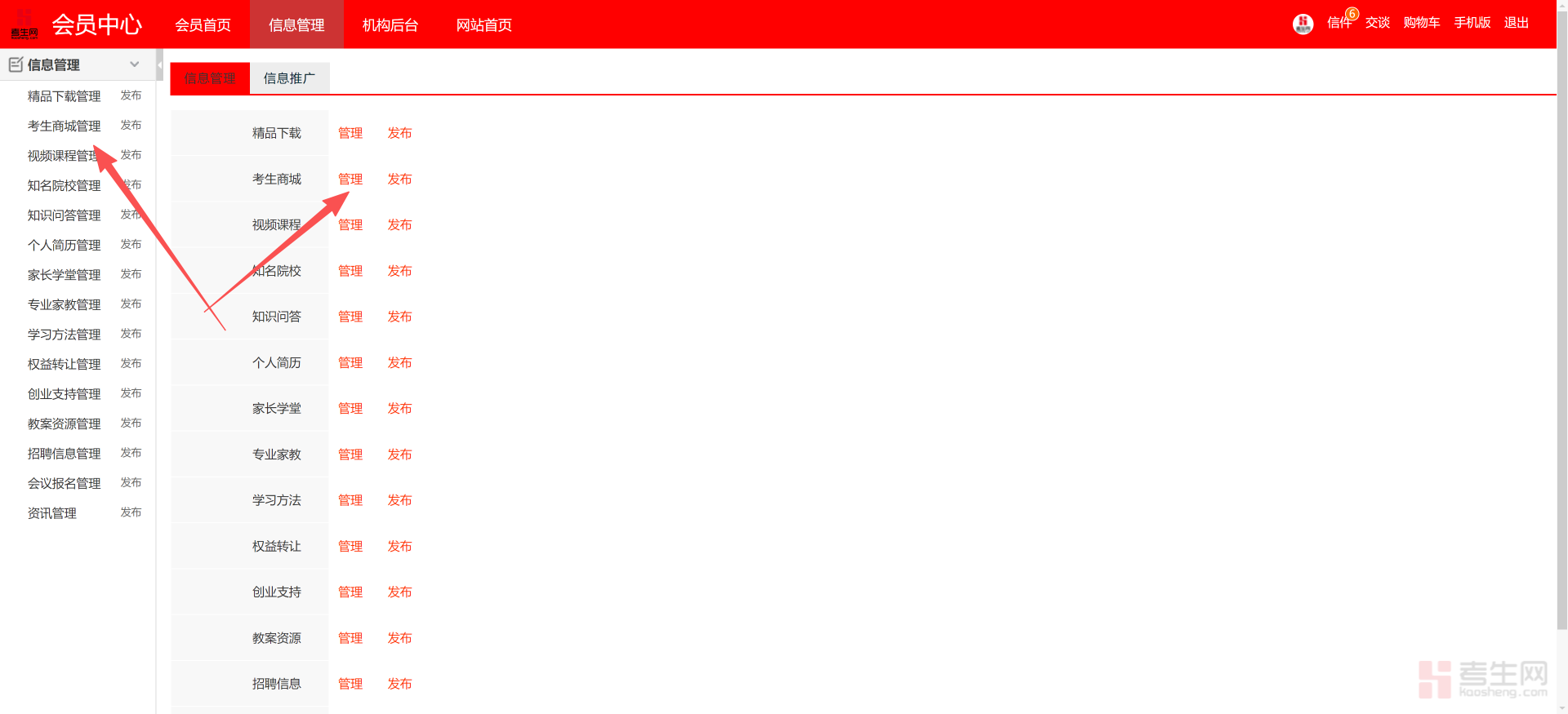 现在我们就可以进入信息管理的页面,我们要在商城里面发布商品,就要点考生商城的管理,左侧菜单栏和主页面里的管理、发布功能是完全一致的,点那个都可以
