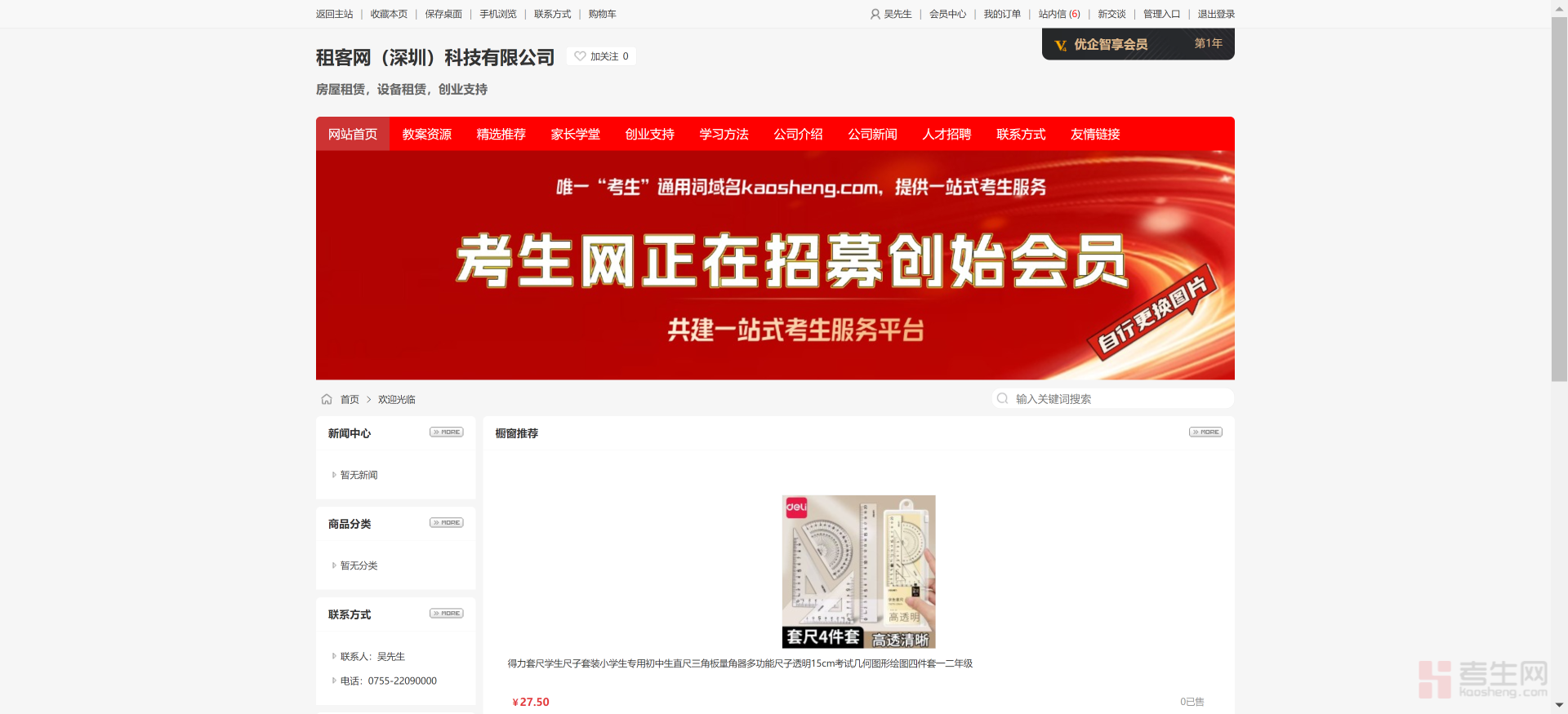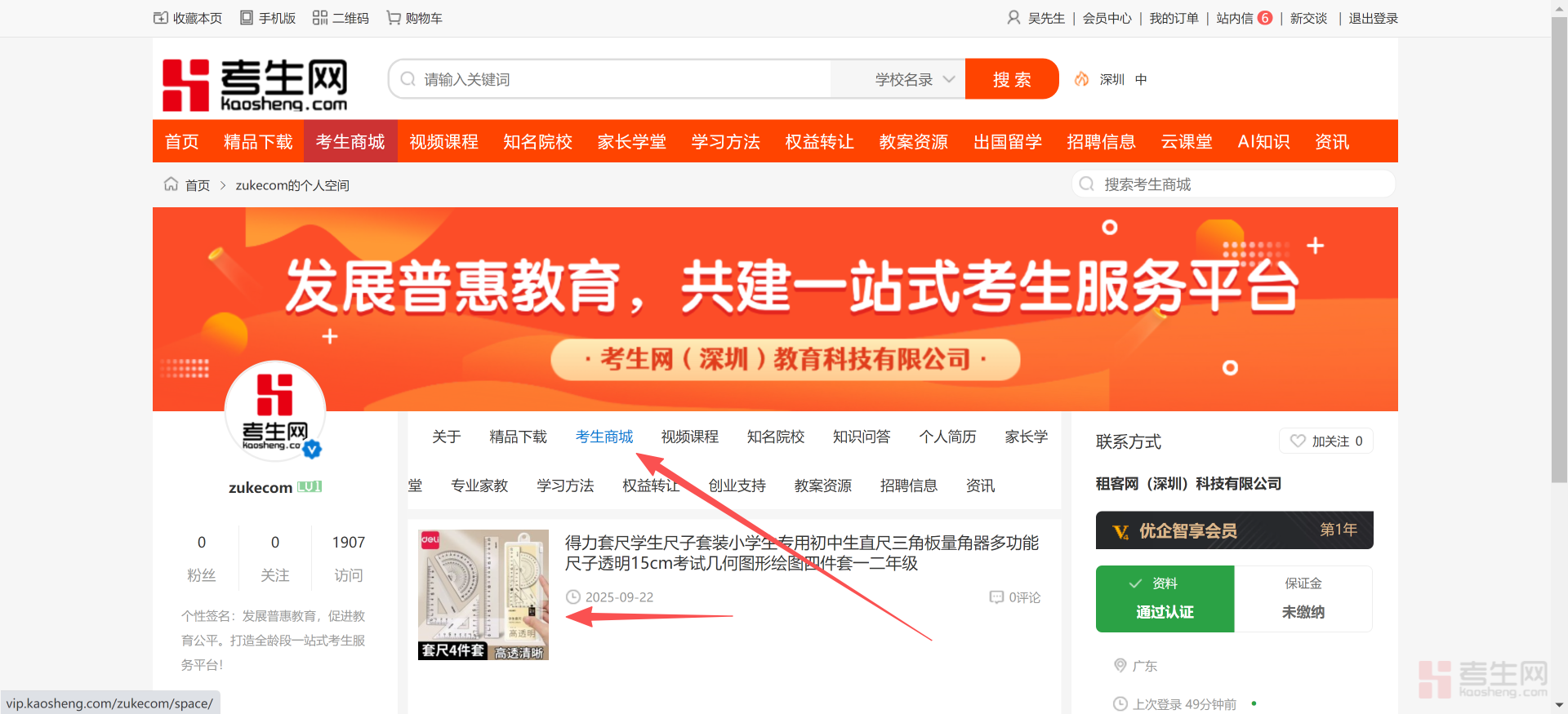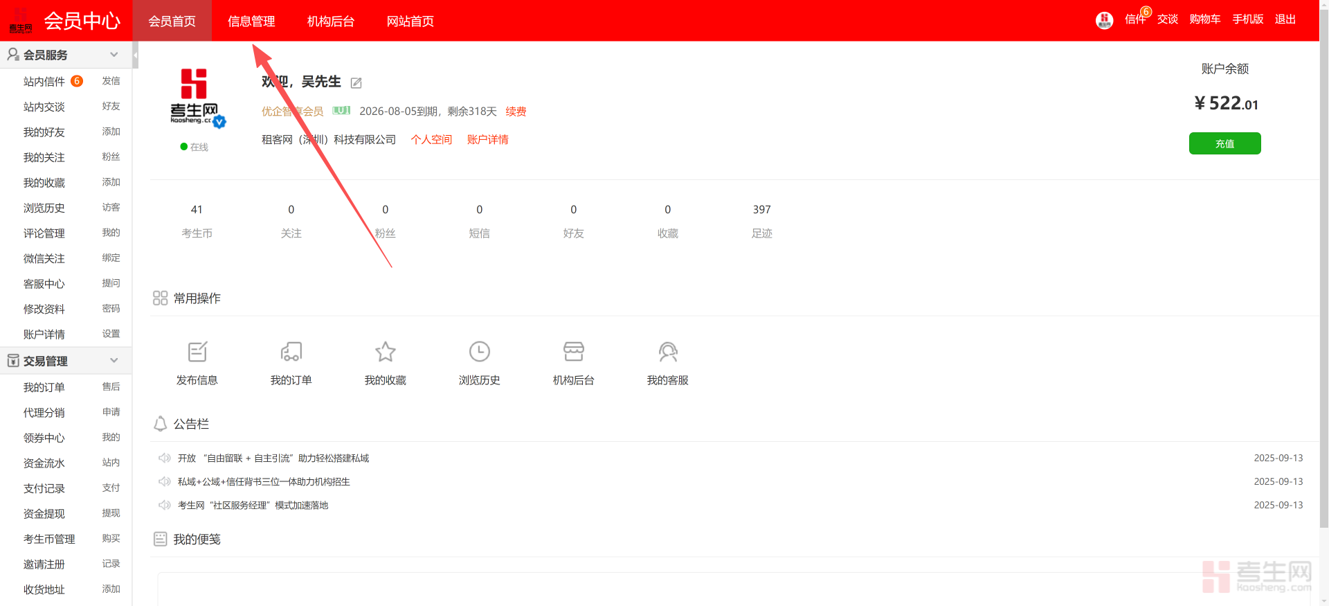 现在我们就可以进入信息管理的页面,我们要在商城里面发布商品,就要点考生商城的管理,左侧菜单栏和主页面里的管理、发布功能是完全一致的,点那个都可以