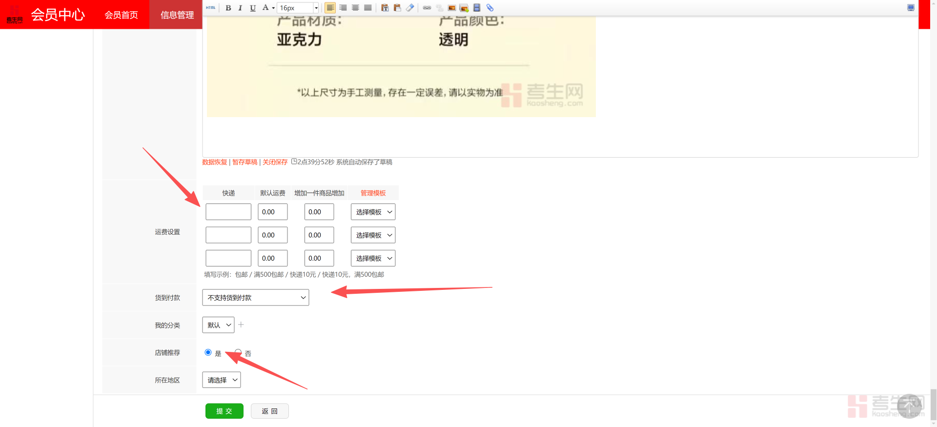 现在,按图示填写信息,我们很多小伙伴是高级会员身份,拥有自己的个人空间和企业网站,如果您要让产品在自己的企业网站和个人空间展示,需要在店铺推荐中选择“是”,然后点提交就提交完成了。