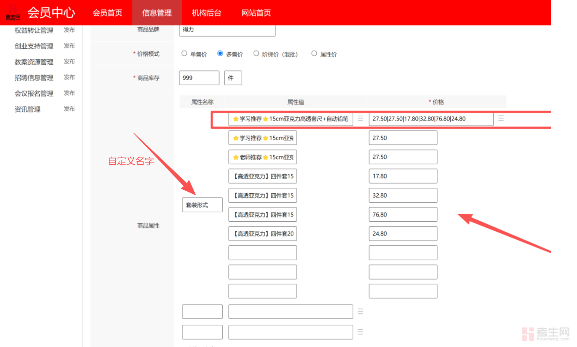 我们参照淘宝的一个得力店铺填写,每个价格比他便宜一点点,因为我们只是为了掩饰,这个只做简单的几个属性对应的价格。属性名称,可以自己定义