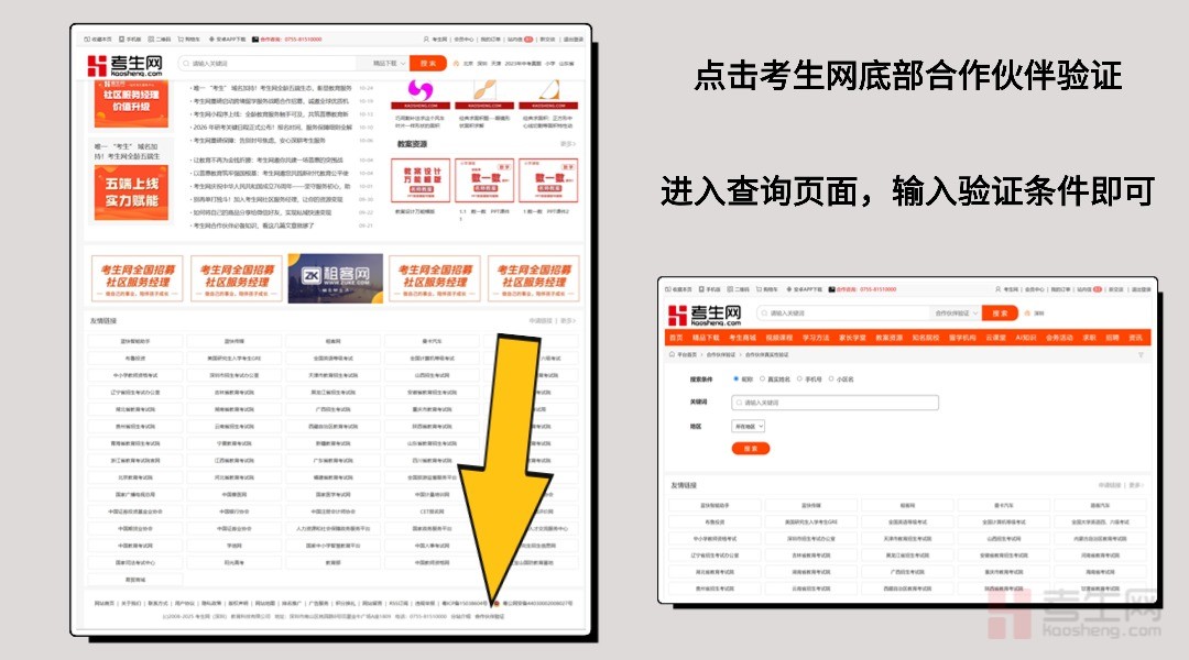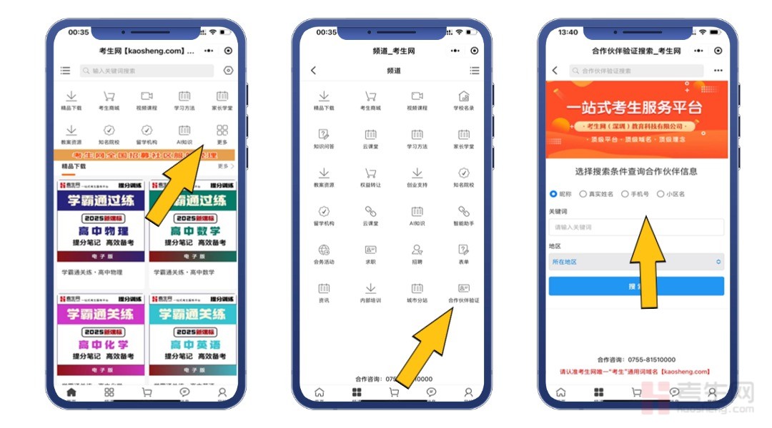 查询及合作申请方式:PC端在浏览器输入kaosheng.com即可使用考生网,微信服务号搜索“考生网官方账号”,微信小程序搜索“考生网官方平台”,均可使用。打开考生我后,进入 “合作伙伴验证” 板块操作,PC端入口在页面底部可以看到“合作伙伴验证”入口,在移动端,可以查看更多里面找到入口。
