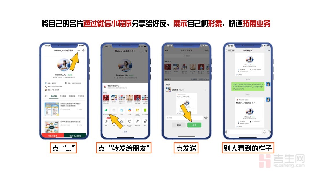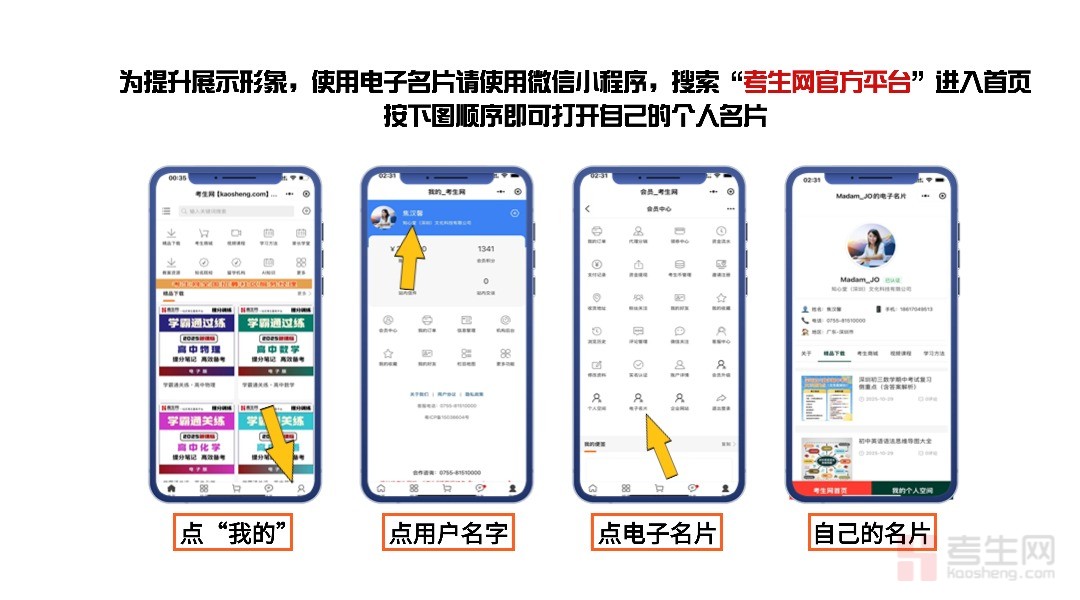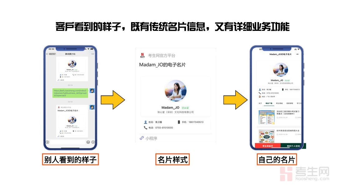 相较于传统电子名片仅承载联系方式的单一属性,考生网此次迭代的移动端电子名片,实现了 “功能维度的全面拓展”,其核心亮点集中在三大场景: